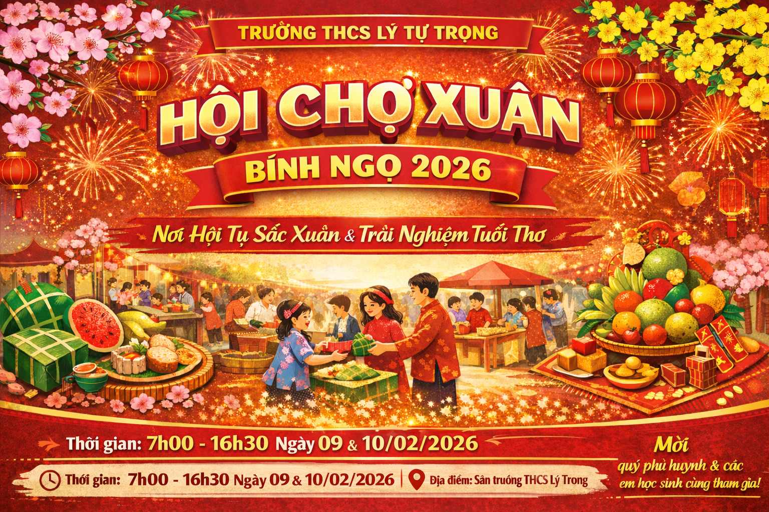 Liên đội Trường THCS Lý Tự Trọng trân trọng tổ chức Hội chợ Xuân Bính Ngọ 2026, mang đến không gian văn hóa Tết truyền thống với những gian hàng ẩm thực dân gian, mâm ngũ quả rực rỡ và các hoạt động trải nghiệm đầy sáng tạo do chính học sinh thực hiện.