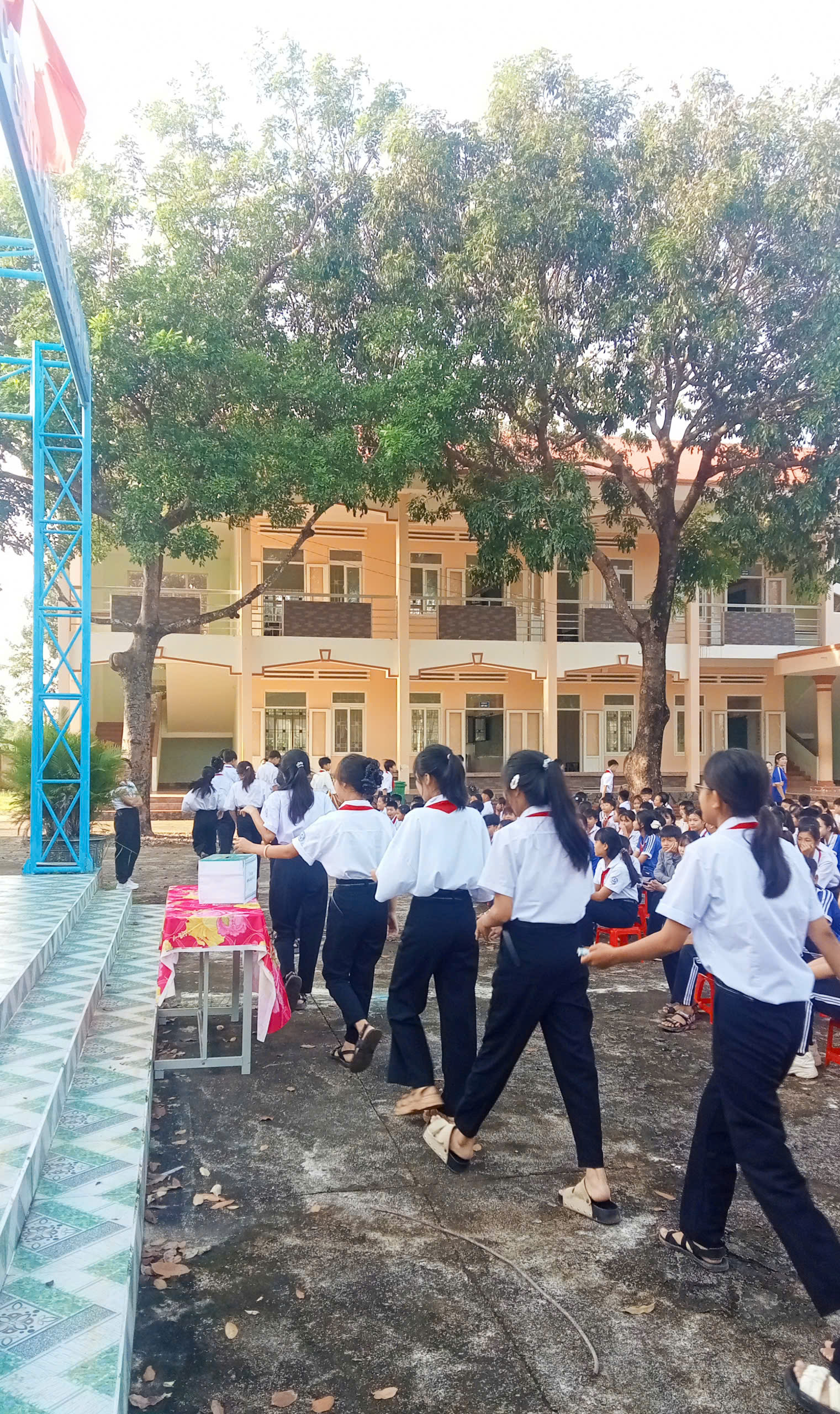 Buổi lễ diễn ra trong sự háo hức và lan tỏa yêu thương của thầy cô và học sinh toàn trường. Mỗi tấm lòng, dù nhỏ bé, đều được gói trọn trong những phong bì, những túi quà, những món đồ thiết yếu – là sự sẻ chia chân thành gửi tới miền Trung ruột thịt.